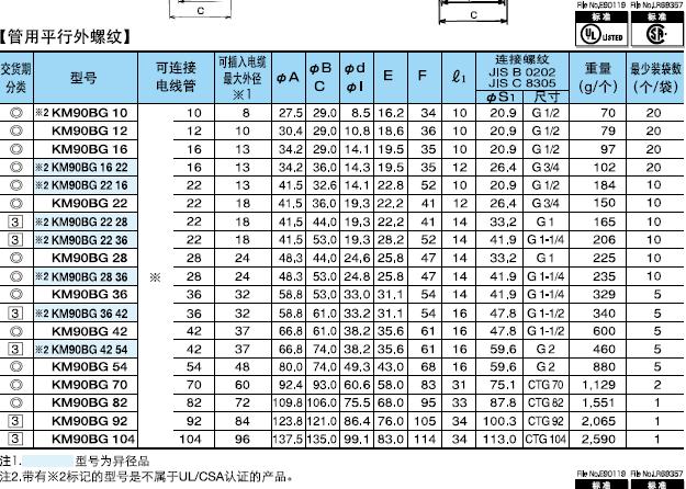 ·關(guān)于表中的※1標(biāo)記,可插入電纜的最大外徑是以本體最小內(nèi)徑為標(biāo)準(zhǔn)的。電纜穿過(guò)90°型本體部時(shí),因電纜原因有不能穿線的情況,所以請(qǐng)以最大外徑的40-60%的外徑作為基準(zhǔn)。