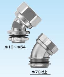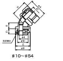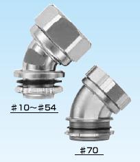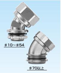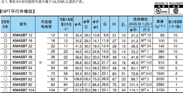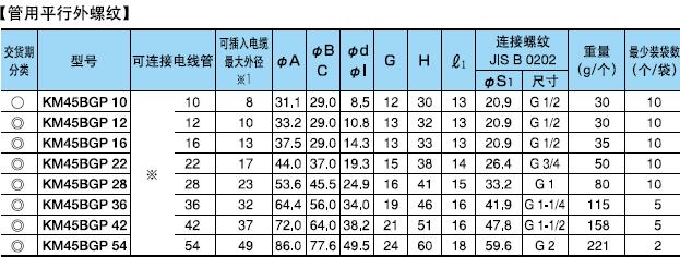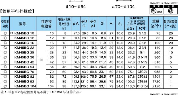 ·金屬軟管與配電盤等嵌入連接用的45°形接頭。 ·表中的[可連接金屬軟管]欄內的※號,代表KMS、KMV、KPF、KIC、KIH、KIV、KPBF、KUU、KCS、KMB、KIB、KM、KI。 ·金屬軟管與接頭的拉伸強度,#10尺寸為500N(JIS中級),#12-54尺寸為1000N(JIS高級),#70尺寸以上為2500N(JIS超高級)。 ·關于表中的※1標記,可插入電纜的最大外徑是以本體最小內徑為標準的。電纜穿過45°型本體部時,因電纜原因有不能穿線的情況,所以請以最大外徑的40-60%的外徑作為基準。 (在網站“下載中心”里可以下載產品PDF文件)