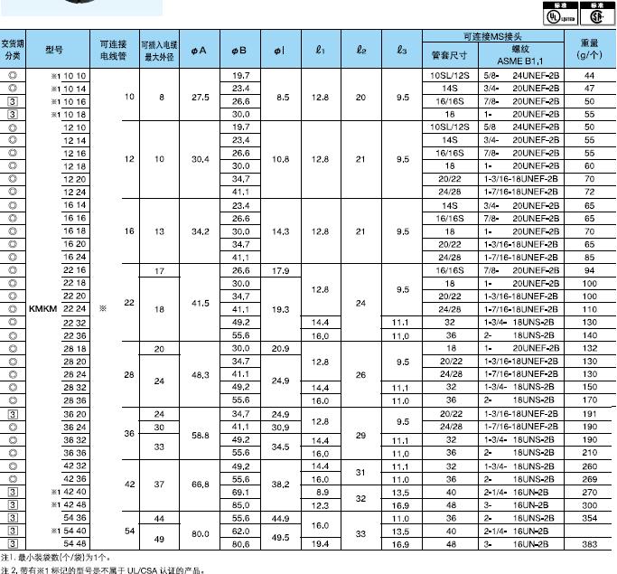 ·金屬軟管與附管套MS接頭連接用的復合接頭。 ·MS接頭與復合接頭連接時請用鋁制立式管鉗、老虎鉗等用力擰緊。 ·表中的[可連接金屬軟管]欄內的※號,代表KMS、KMV、KPF、KIC、KIH、KIV、KPBF、KUU、KCS、KMB、KIB、KM、KI。 ·金屬軟管與復合接頭的拉伸強度,#10尺寸為500N(JIS中級),#12-54尺寸為1000N(JIS高級)。